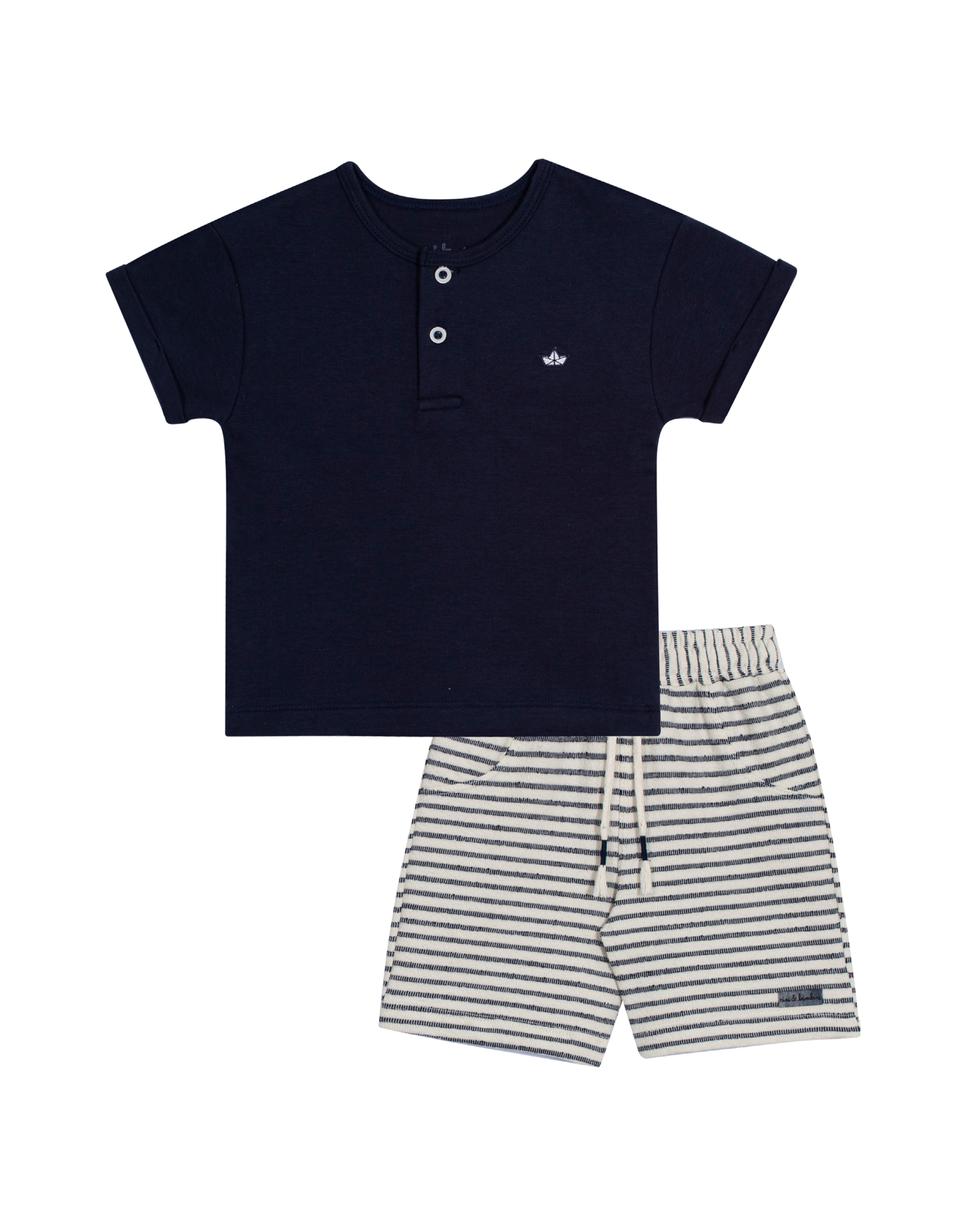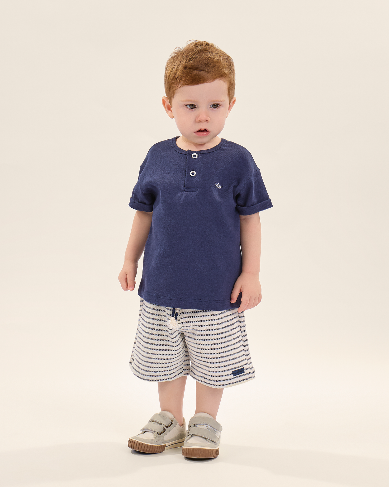 Este conjunto versátil traz um toque navy ao visual, combinando camiseta manga curta azul marinho com bermuda de moletom off white e listras em marinho. O composê com o tecido listrado conecta o detalhe da camiseta à estampa da bermuda, criando um look coordenado e cheio de charme para qualquer momento descontraído. Perfeito para quem quer unir estilo e conforto com um toque marítimo!