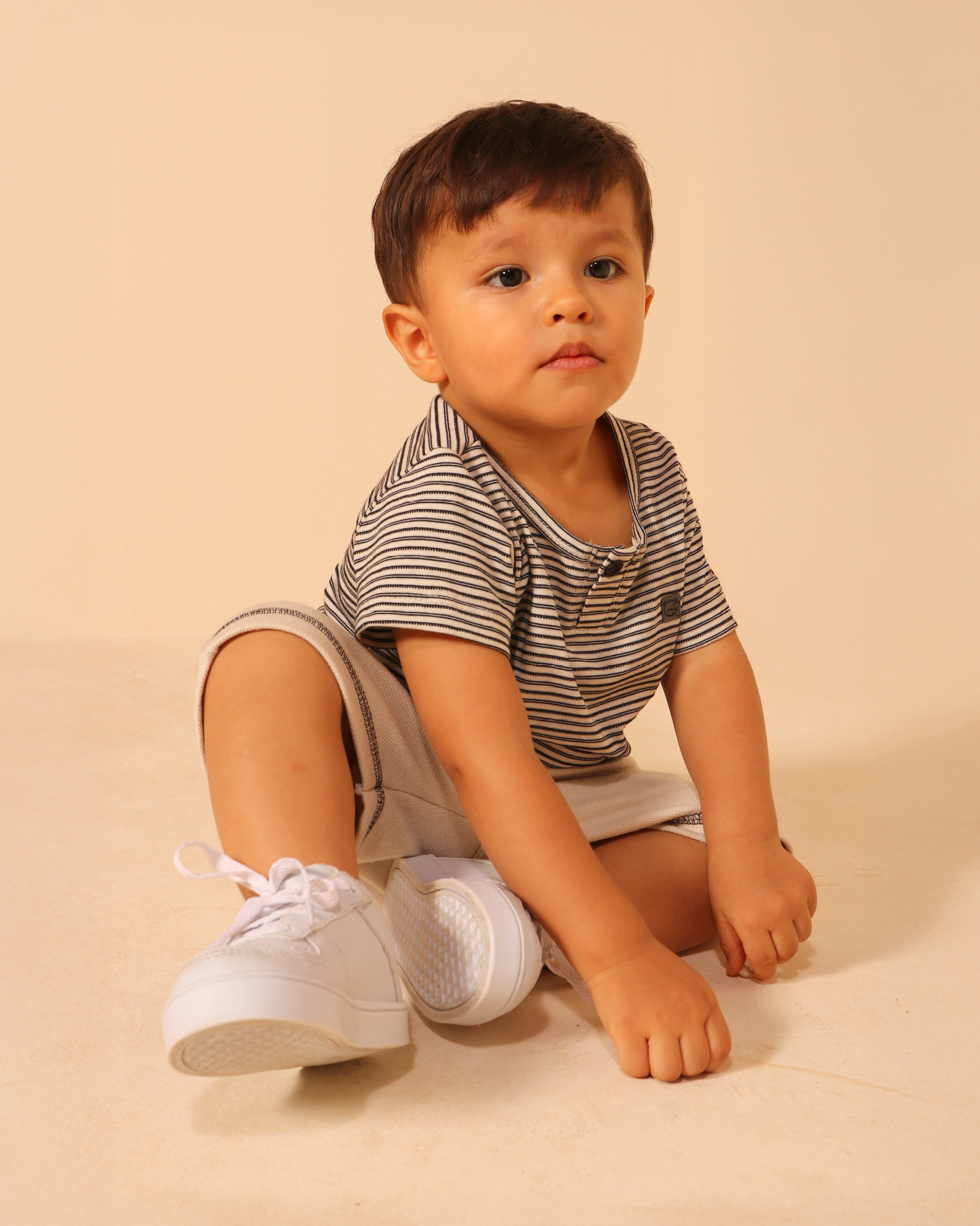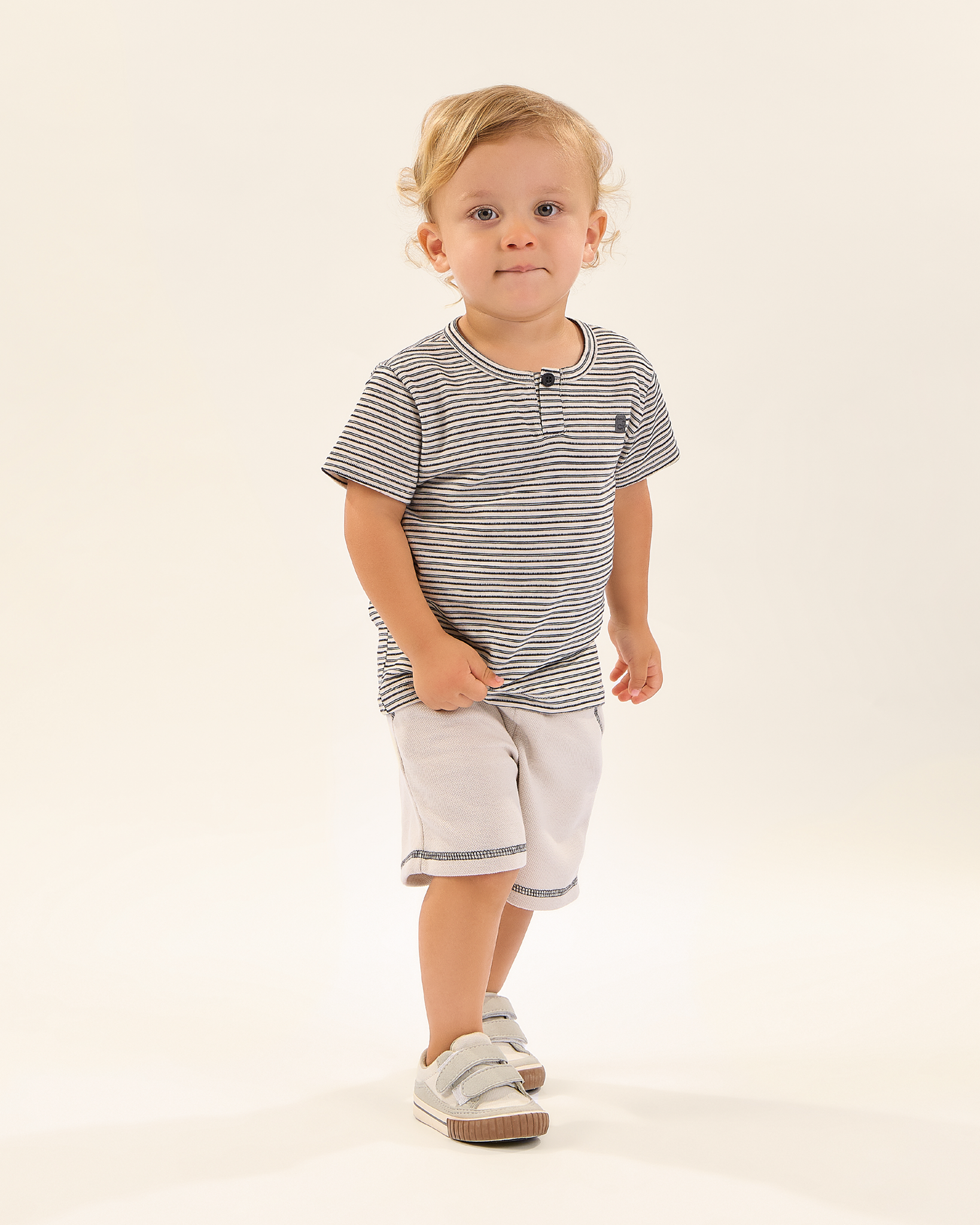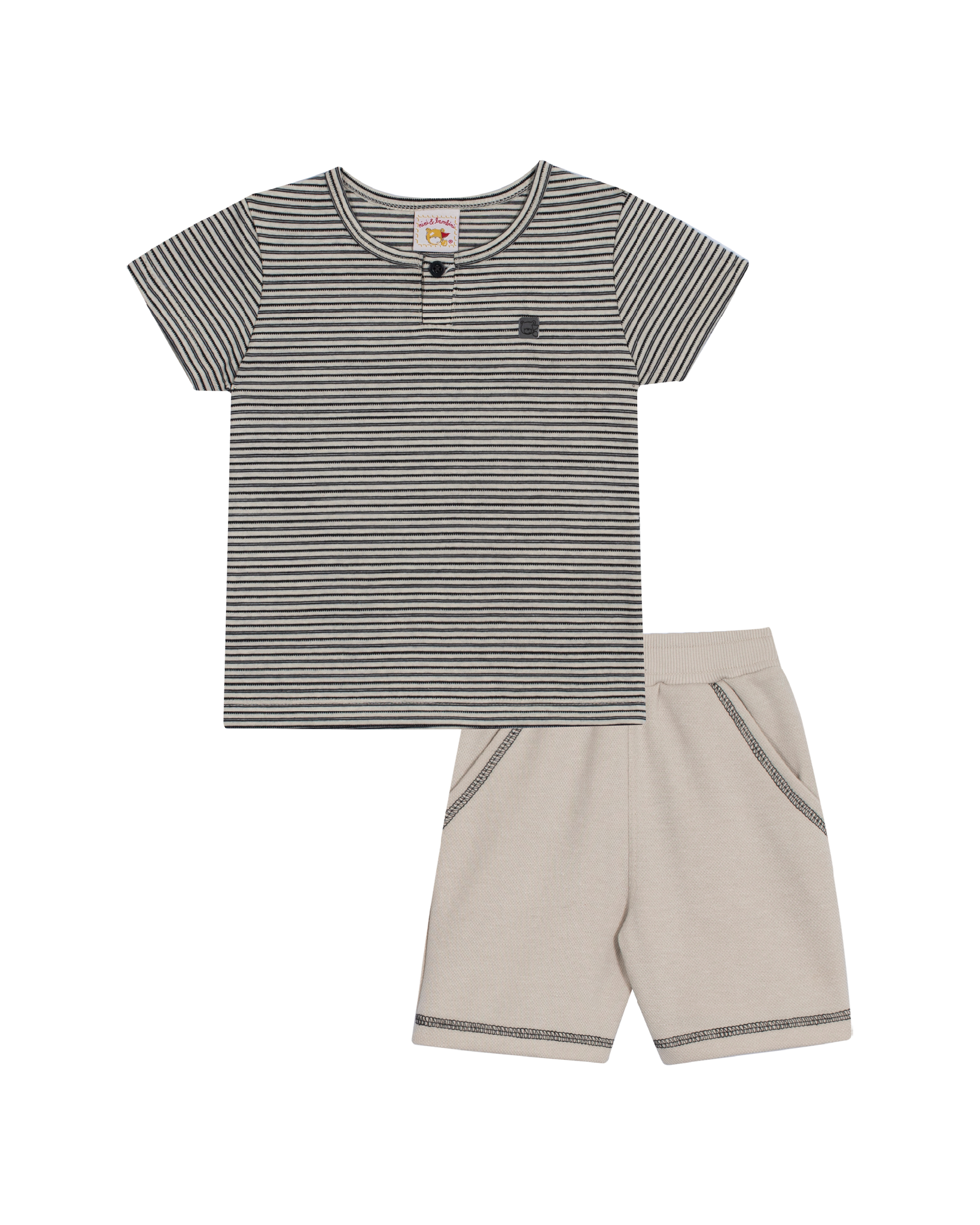 Este conjunto casual combina camiseta listrada de manga curta com bermuda bege em tecido piquetom, formando um look monocromático moderno e descolado. Perfeito para dias de lazer, a combinação traz conforto e estilo, ideal para quem quer estar pronto para qualquer ocasião com um toque de personalidade.