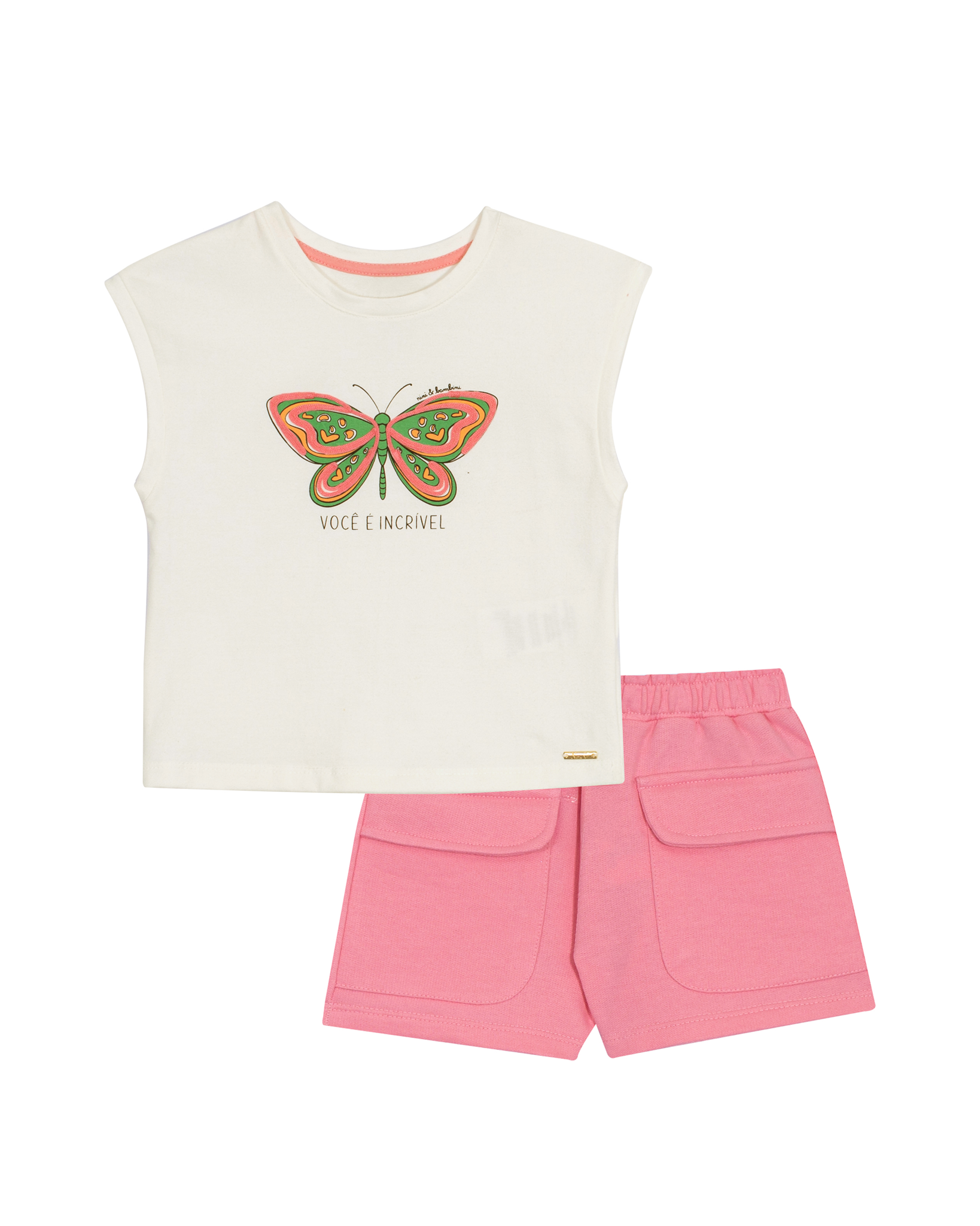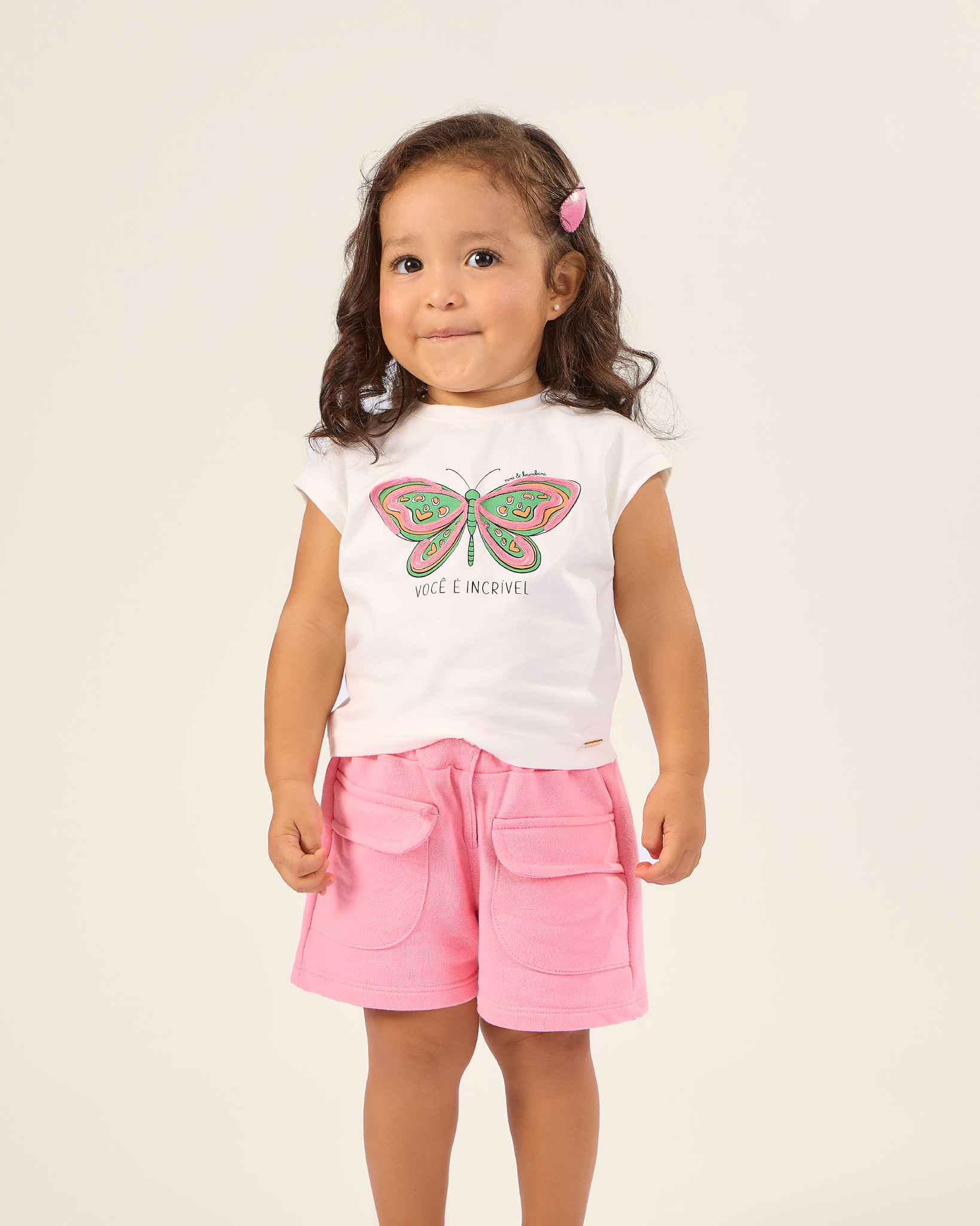 Este conjunto casual traz uma blusa soltinha off white de manga curta com estampa de borboleta em relevo e a frase inspiradora "você é incrível". Combinada com shorts rosa com bolsos cargo, foi criado para quem ama um toque de rosa no visual. Perfeito para um look casual cheio de charme e atitude divertida.