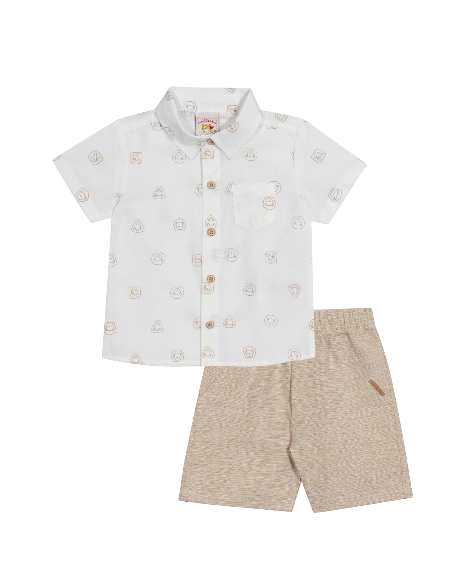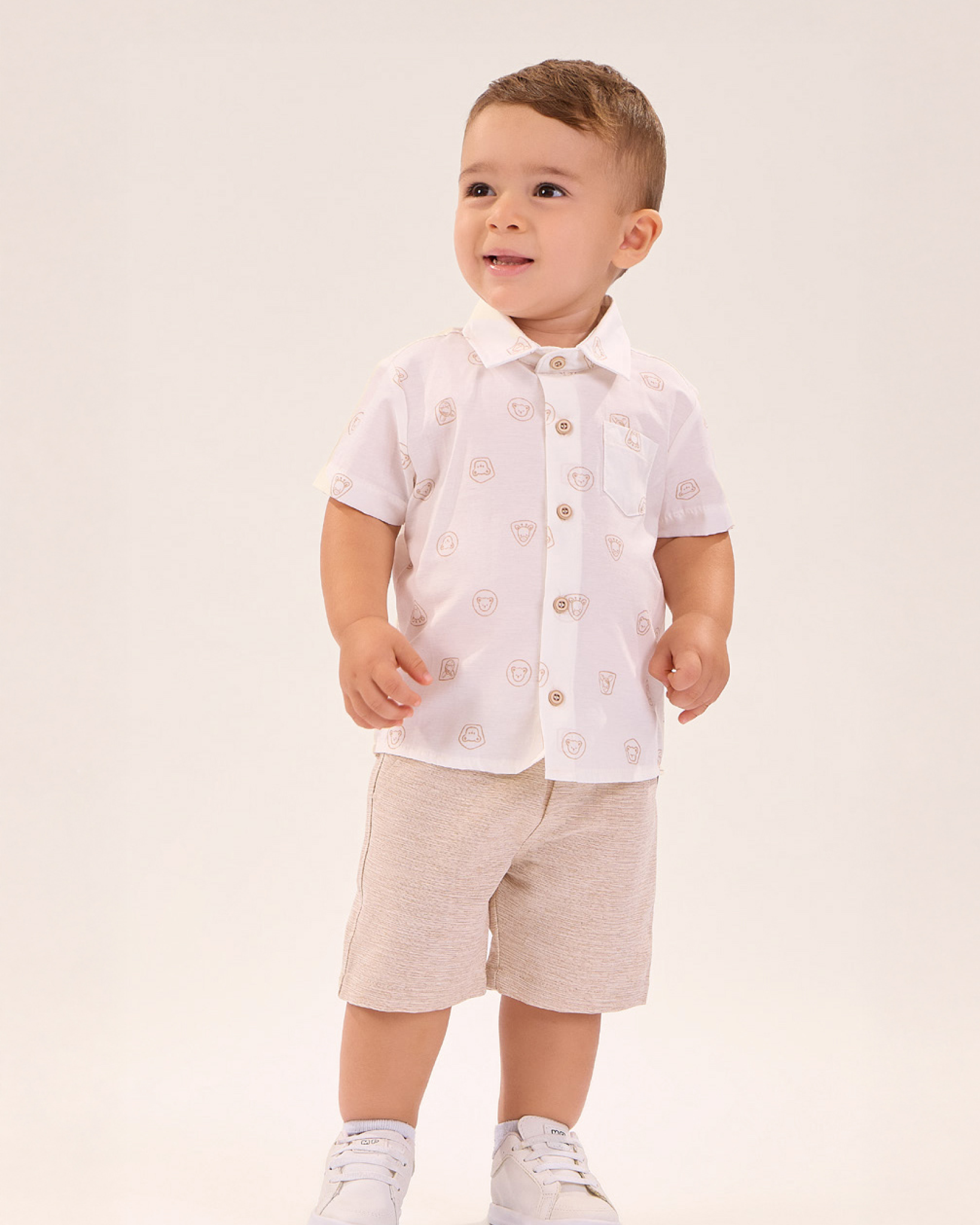Este conjunto leve e arrumadinho combina conforto e estilo. A versátil camisa de manga curta possui estampas minimalistas de animais, enquanto a bermuda de linho garante frescor e toque natural. Aquele look neutro com uma pitada extra de charme!