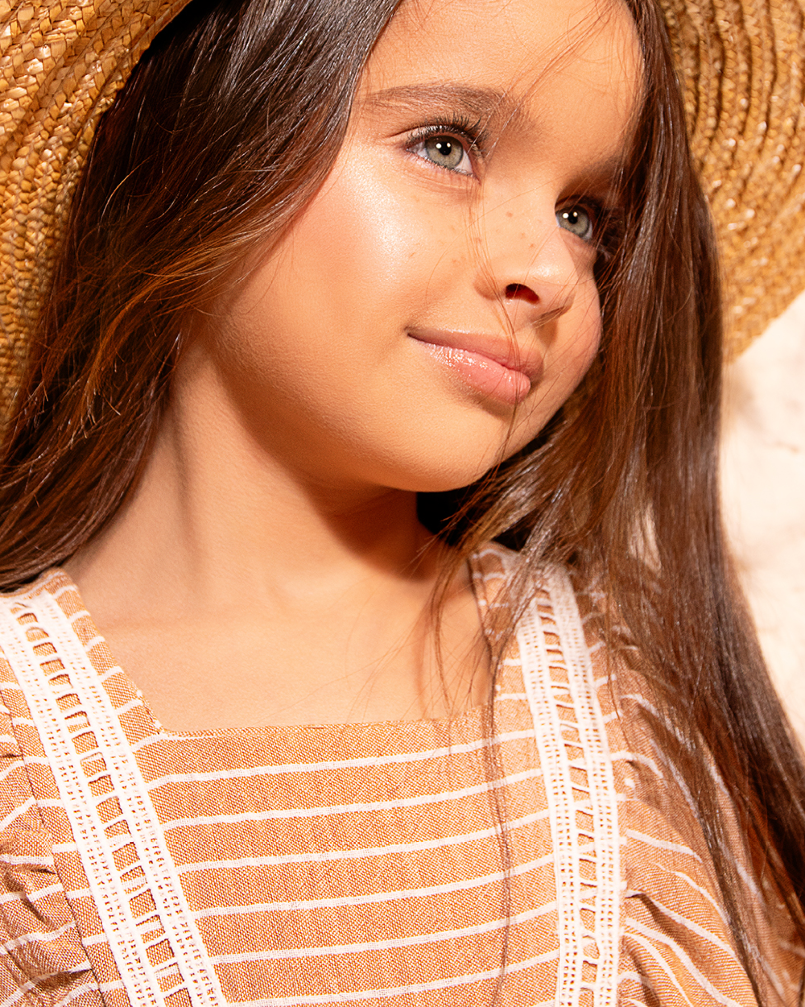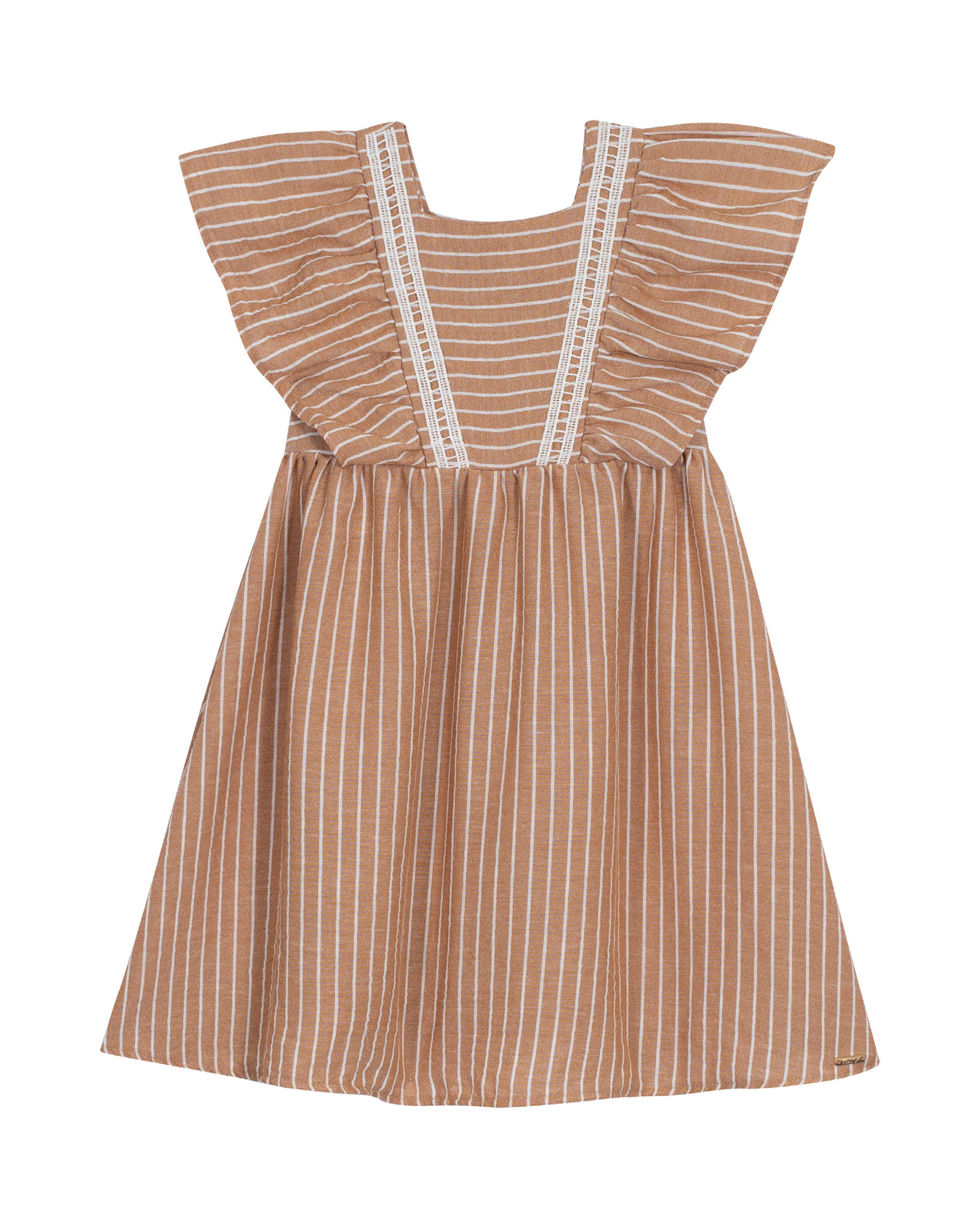 Este esvoaçante vestido listrado bege com mangas de babado é encantador e traz um toque romântico e delicado para o look. Leve e confortável, ele combina charme e movimento, perfeito para passeios ou ocasiões especiais.