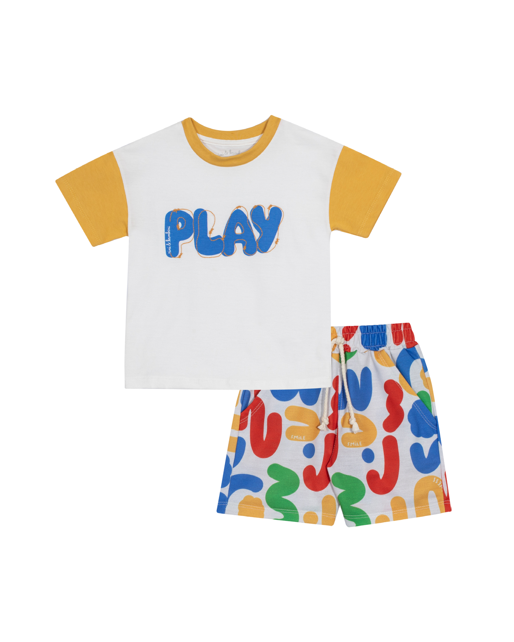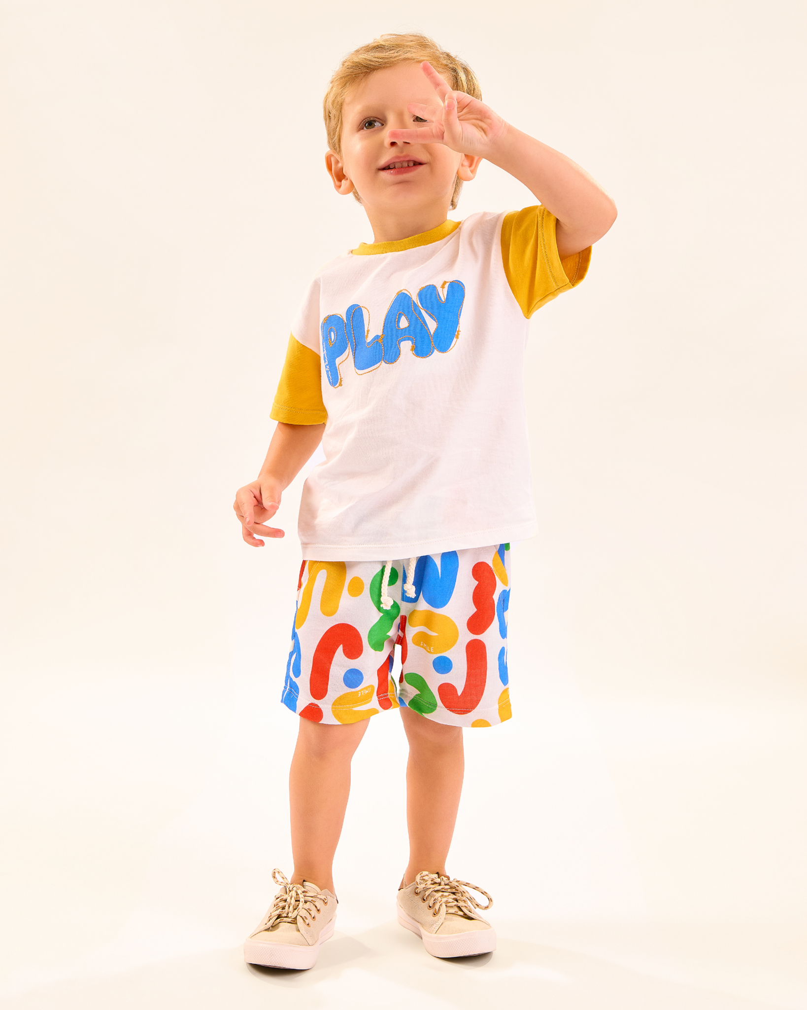 Este conjunto cheio de energia faz parte da collab Viih Rocha e combina camiseta de manga curta com bermuda estampada colorida. A camiseta off white possui mangas e colarinho em amarelo e estampa da palavra "play" com contorno bordado. Um look colorido para acompanhar momentos de diversão.