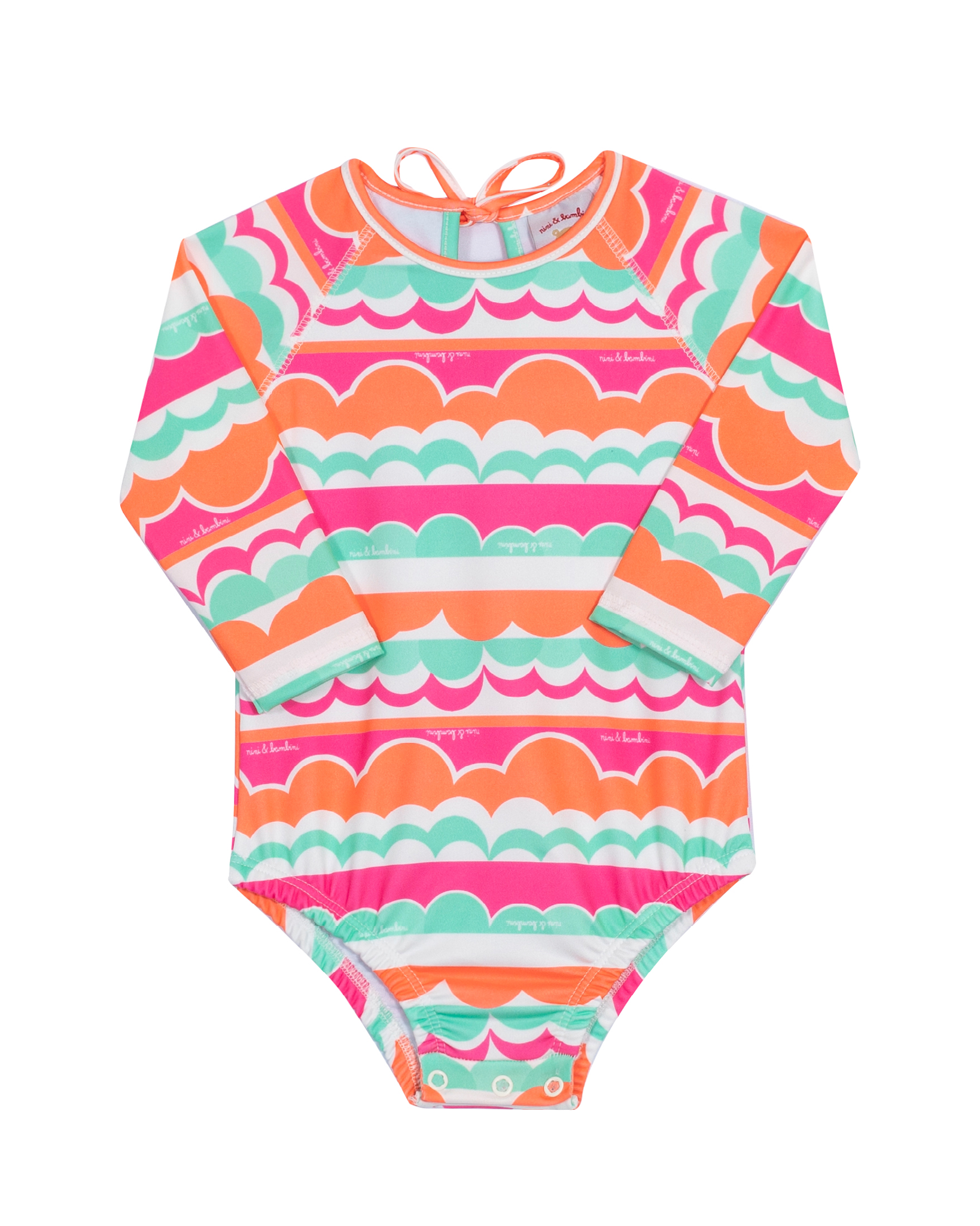 Mergulhe na diversão com este maiô de manga longa colorido com estampa de ondas. Oferece proteção solar UV 50+, bloqueando até 98% dos raios UVA e UVB. O acabamento não sai na lavagem e o tecido proporciona secagem rápida. O tecido leve garante conforto para brincar à vontade na praia ou na piscina, perfeito para quem quer estilo e proteção em um só look!