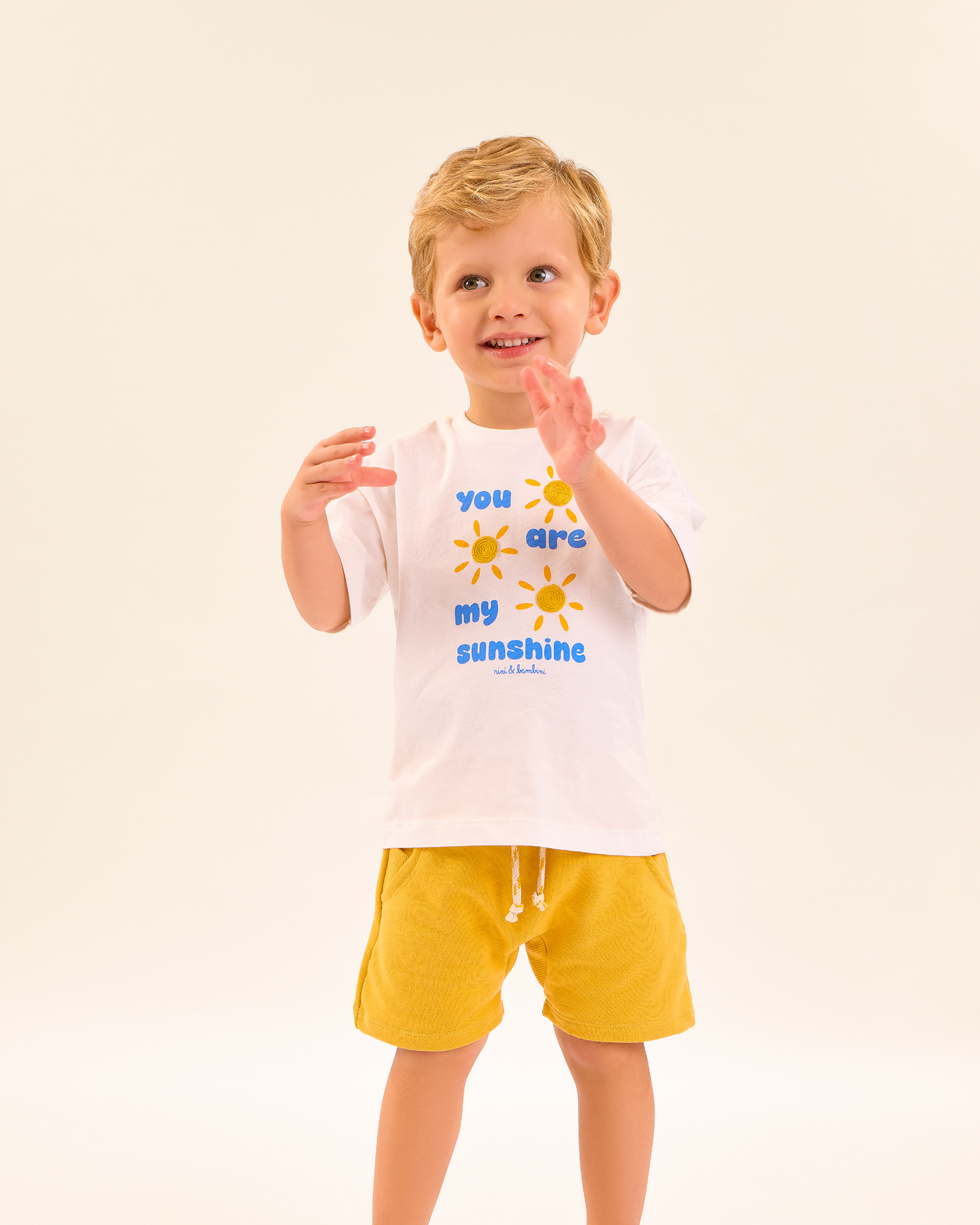 Este ensolarado conjunto faz parte da collab Viih Rocha e combina camiseta de manga curta e bermuda saruel amarela. Na camiseta se destaca a frase "you are my sunshine" com uma delicada aplicação de sóis entre as palavras. Perfeito para acompanhar todas as brincadeiras com leveza e conforto.