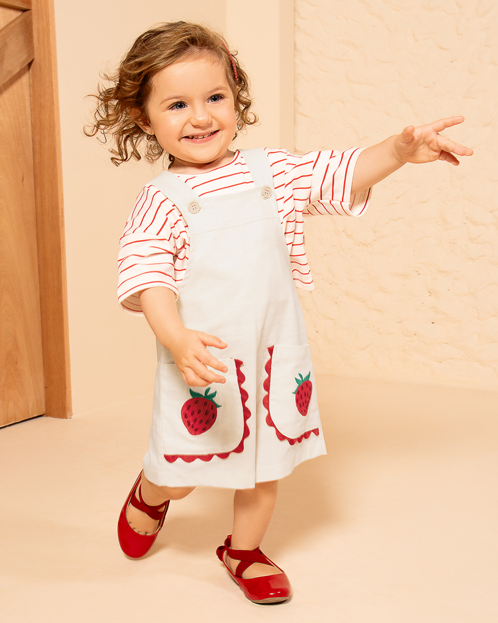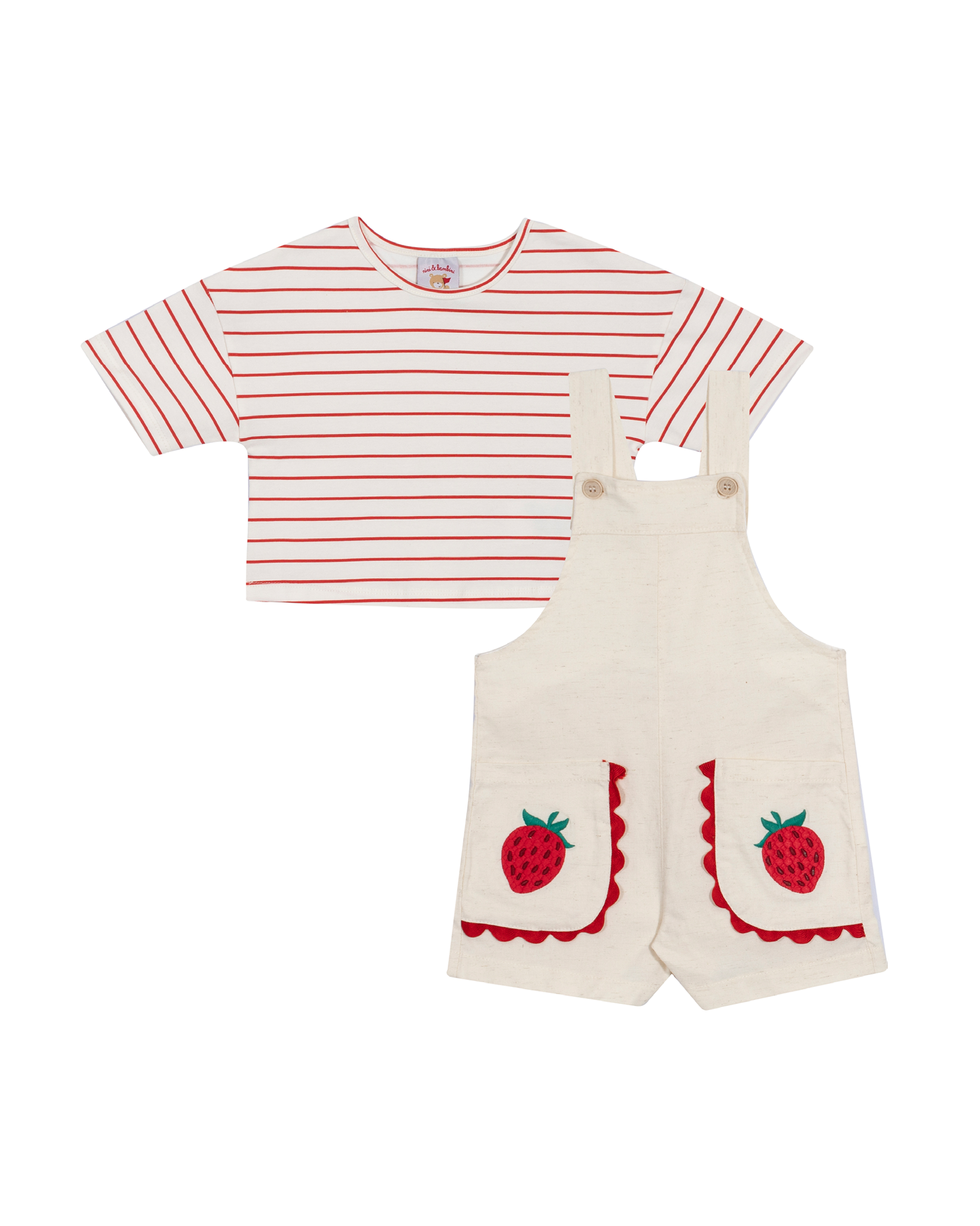 Jardineira linho moranguinhos + blusa manga curta listrada vermelha